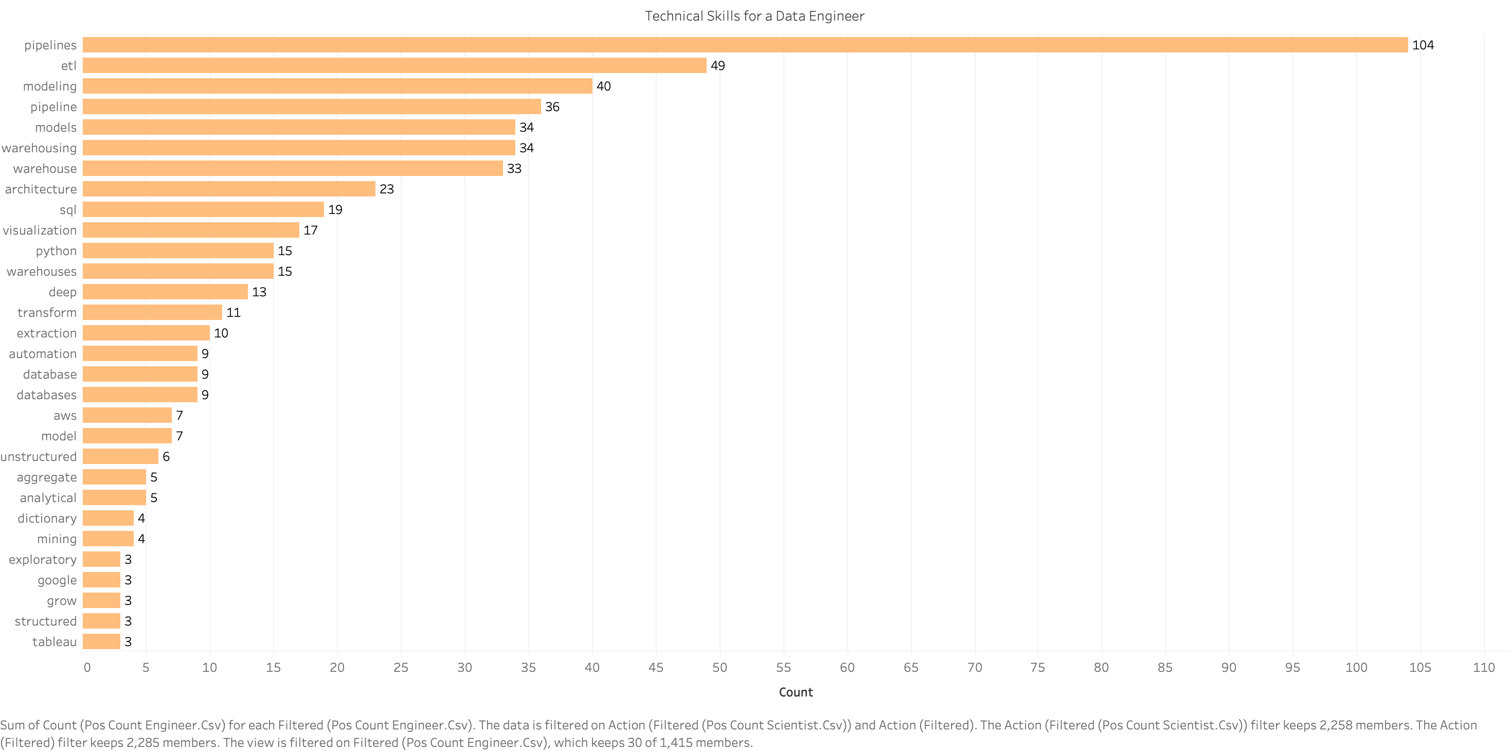 For our final project, we wanted to determine the skills required for the top data analyst roles: Data Analyst, Data Scientist, and Data Engineer. In order to find the most sought after skills employers are seeking for each position, we scraped a popular job board, Indeed.com, to obtain job title, job description, location, etc for positions posted in California. Next, we combined the data and used a Natural Language Processing model to analyze the importance of words within the job descriptions and have determined a confidence rating for the top data analyst roles. Finally, we used Tableau to create visualizations of the data to understand the importance and frequency of the words.